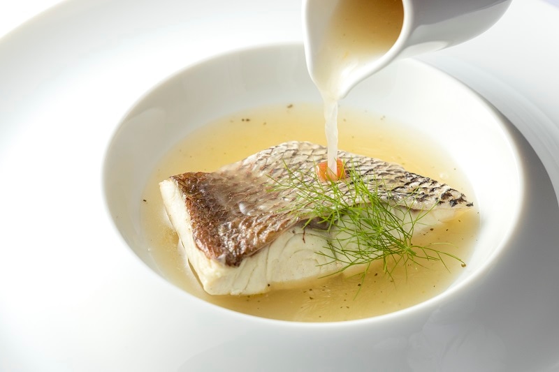 スープ仕立てで季節の天然魚をお楽しみいただく魚のメイン料理です。