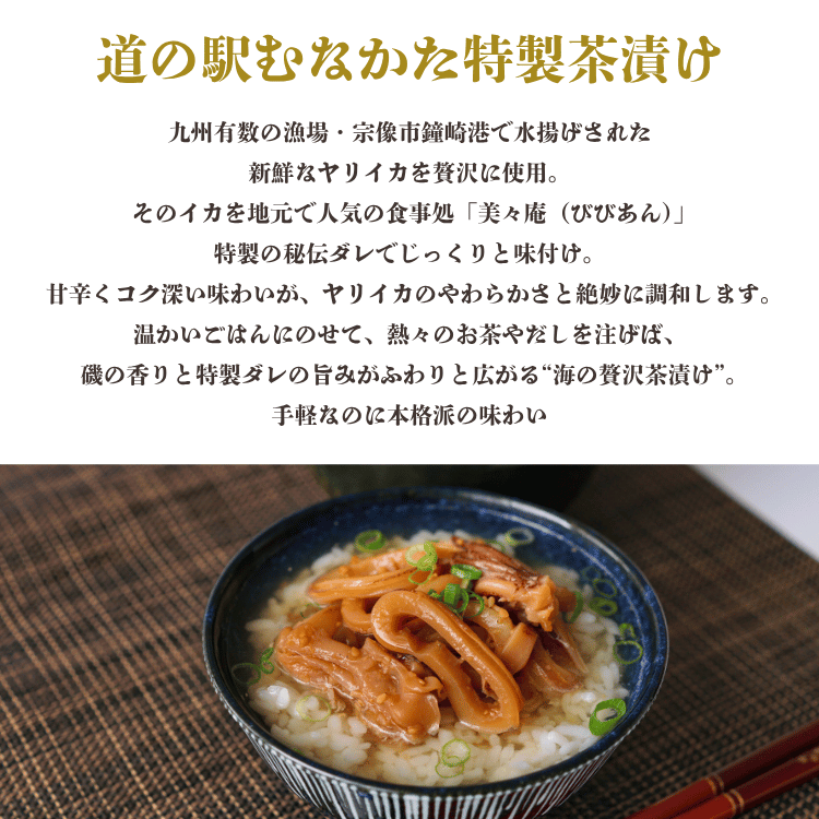 そのイカを地元で人気の食事処「美々庵(びびあん)」特製の秘伝ダレでじっくりと味付けした道の駅むなかた特製茶漬けです。