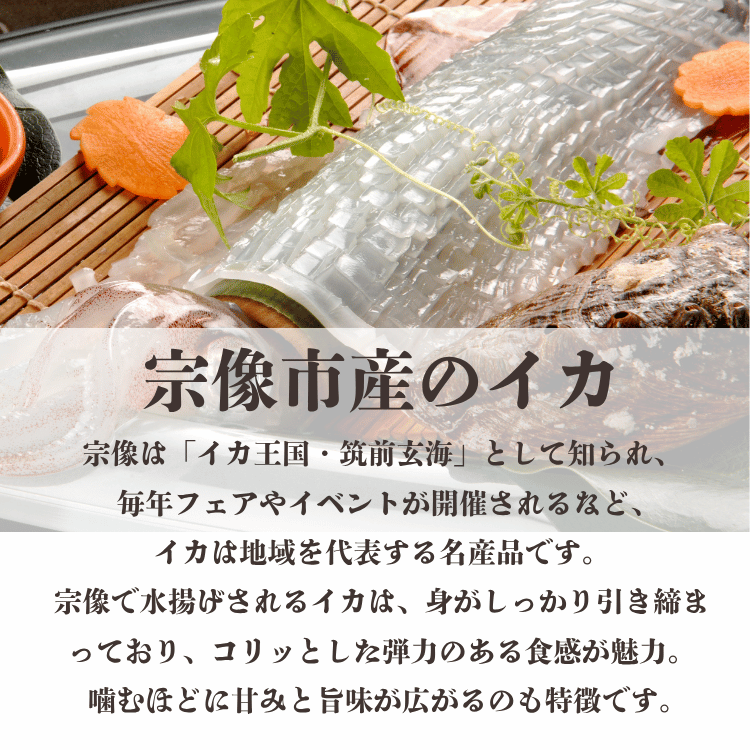 九州有数の漁場・宗像市鐘崎港で水揚げされた新鮮な天然ヤリイカを贅沢に使用。